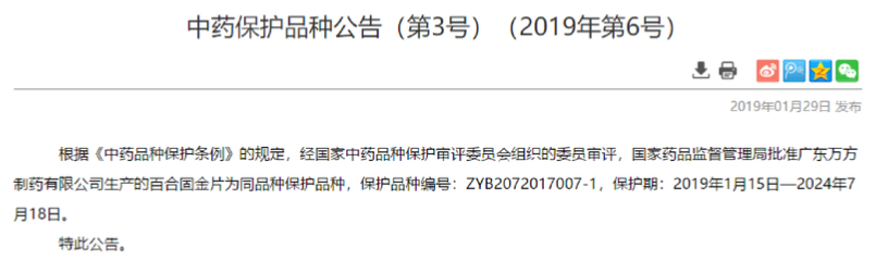 2019年1月24日根据《中药品种保护条例》的规定,经国家中药品种保护审评委员会组织的委员审评,国家药品监督管理局批准我公司服务客户广东万方制药有限公司生产的百合固金片为中药保护品种,保护品种编号:ZYB2072017007-1,保护期:2019年1月15日—2024年7月18日。